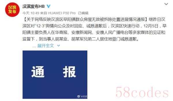 12月6日,陕西省安康市汉滨区委宣传部官方微博@汉滨发布HB 发布了“关于网络反映汉滨区早阳镇群众房屋无故被拆除处置进展情况通报”。