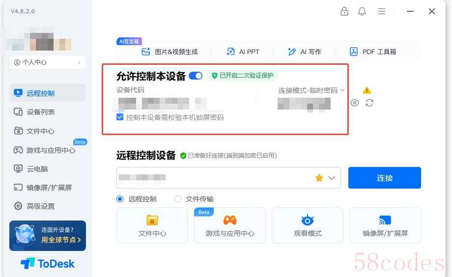 然后记住电脑中ToDesk界面所示的专属设备代码以及临时密码,在iPad中ToDesk界面输入即可。