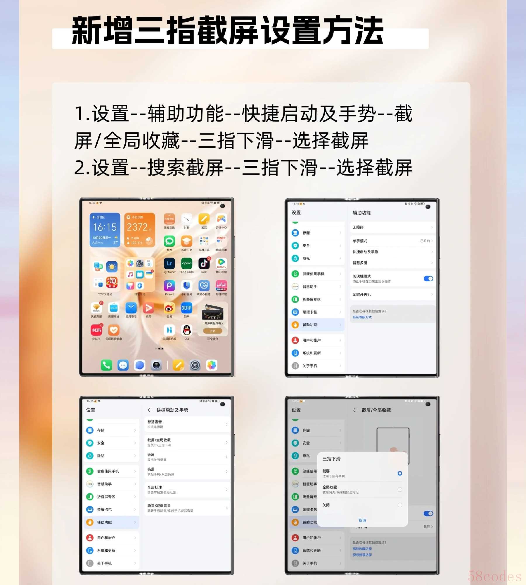 在部分华为机型中,你可以在“设置-辅助功能-快捷启动及手势”中开启“三指下滑截屏”选项。开启后,只需用三根手指同时在屏幕上向下滑动,就能快速截屏。
