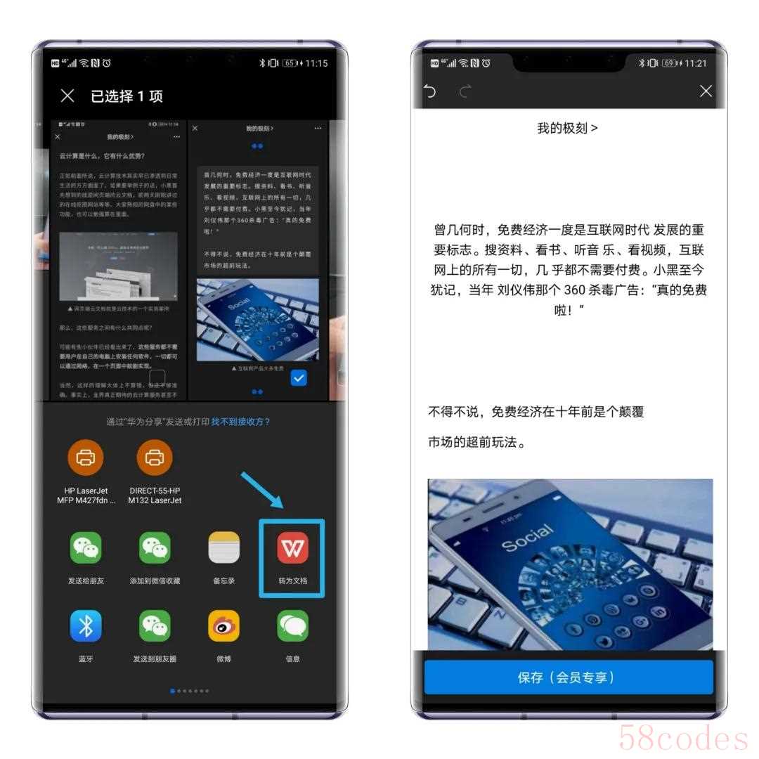 想要得到图片中的文字,如果用键盘一个个敲出来既费时又容易出错。而华为手机打开图片点击分享后找到“转为文档”,就可以把照片中的文字连带图片一起生成一个文档。这个功能对办公人士来说可谓非常友好。