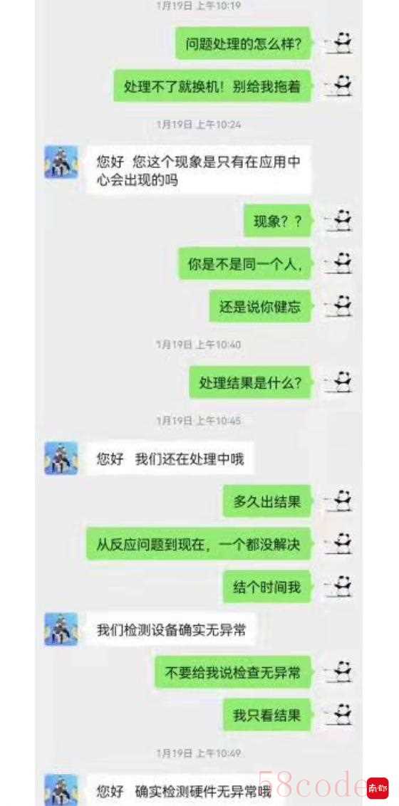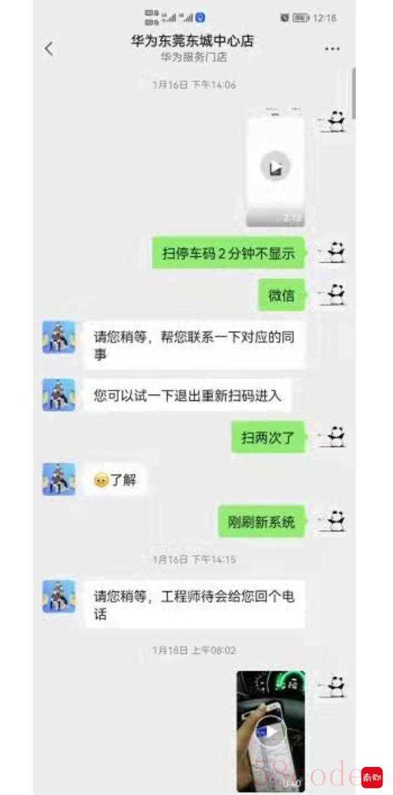 杨女士提供的和华为东城的聊天记录显示,门店在1月16号把手机刷机后,手机仍旧出现扫码转圈等多处故障。期间,杨女士多次将手机出现的问题都录屏发给门店,并表示希望换新机,中心一直都表示硬件检测没有问题,会反馈给技术支持,让杨女士耐心等待。