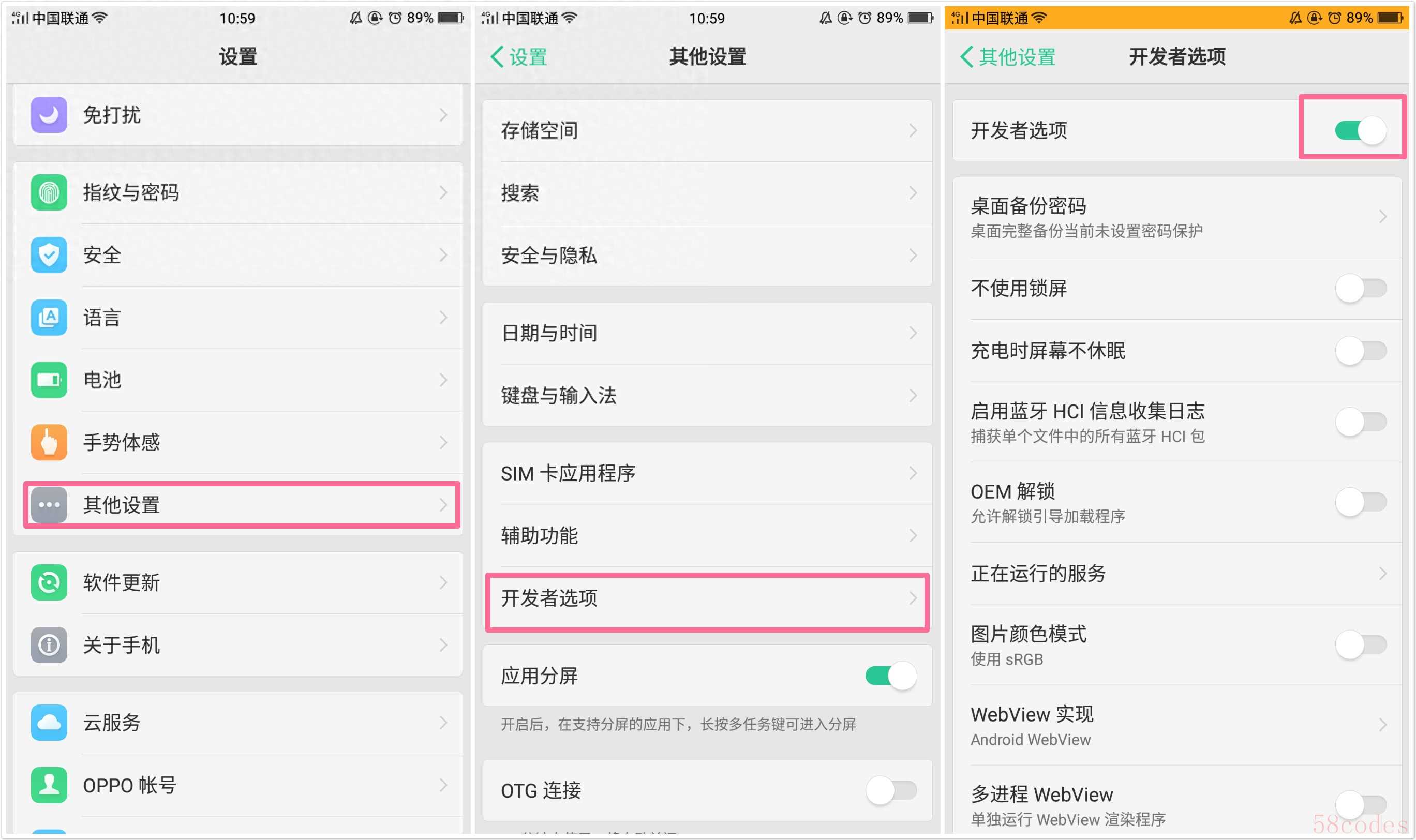 1. "开启开发者选项和USB调试:"