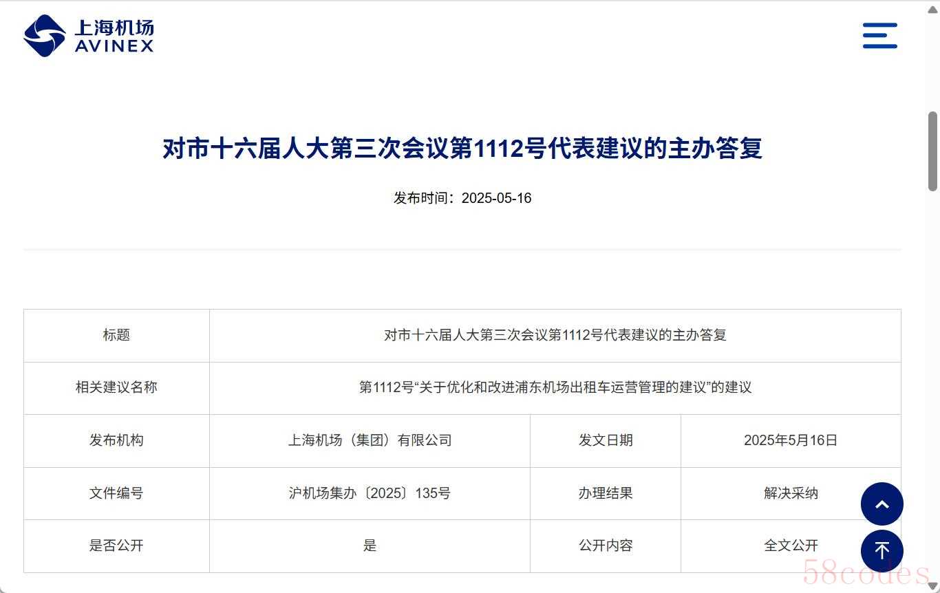 上海机场集团就人大代表有关优化出租车运营的建议作出答复。网站截图