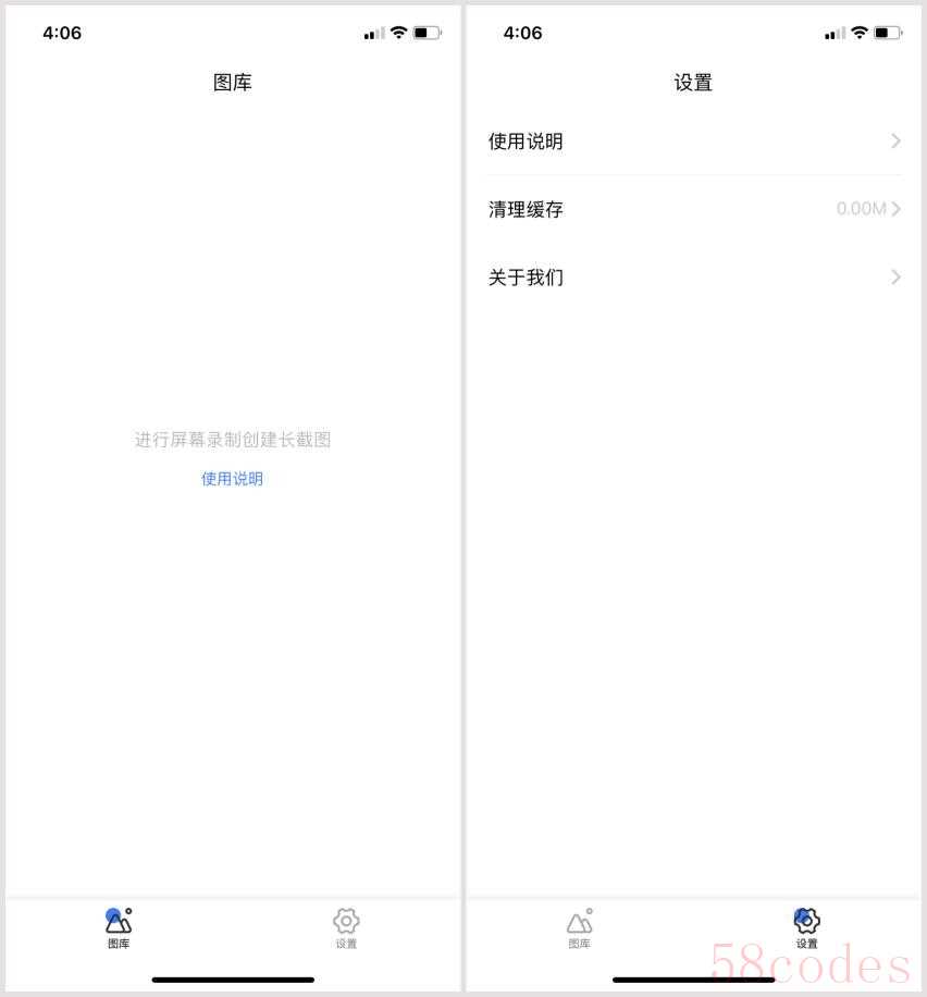 应用界面异常简洁,只有一个用于浏览导出长截图的「图库」,剩下的就是设置了。功能上"滚动长截图"采用录屏的方式完成长截图操作,省去了手动逐张截取再逐一选取合成的过程。