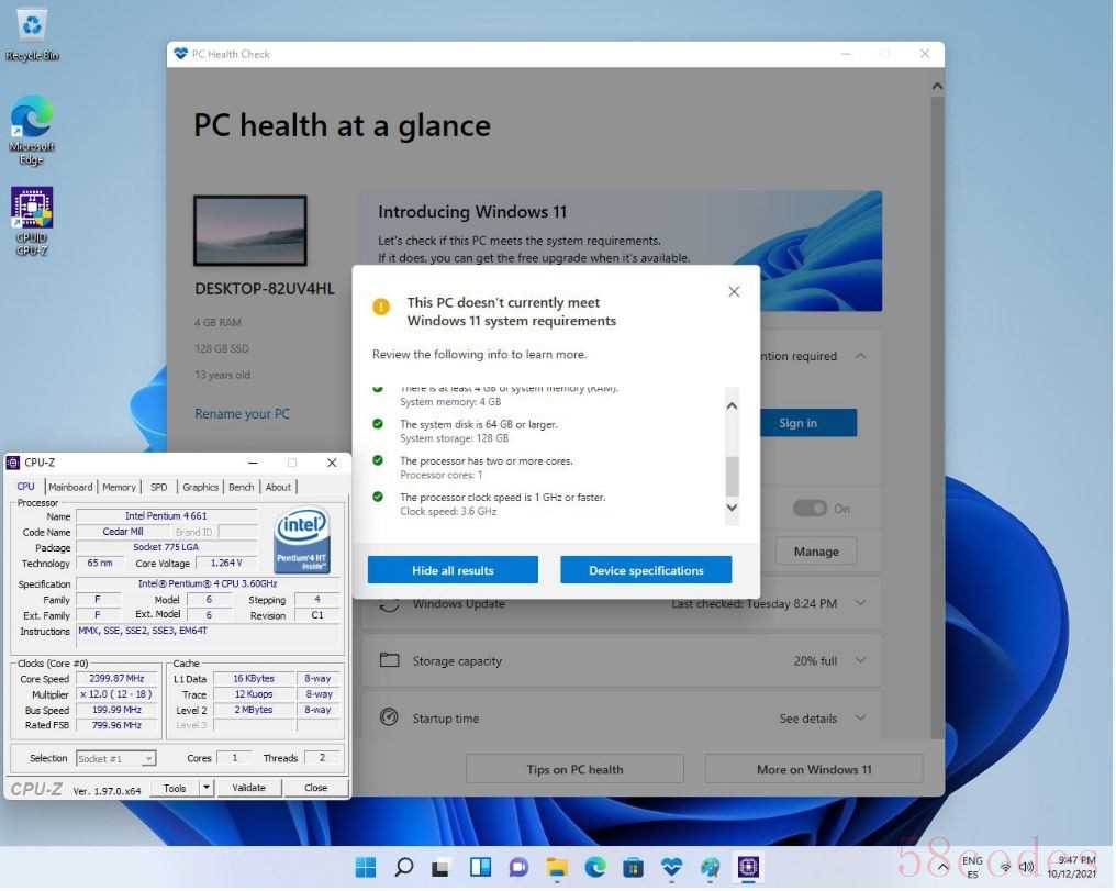 Windows 11正式版已经开推,按照微软的说法,Intel 7代酷睿、AMD二代锐龙及更新的处理器,是推荐支持的平台,更老的硬件,或有安全组件缺失,或体验不佳会遭遇较多的崩溃蓝屏。为了帮助用户甄别,微软特别开发了电脑健康状况检查应用来评估兼容性。然而有趣的是,有网友爆料称,在一台搭载15年前奔腾4 661处理器的PC上,官方工具显示,CPU检查通过。