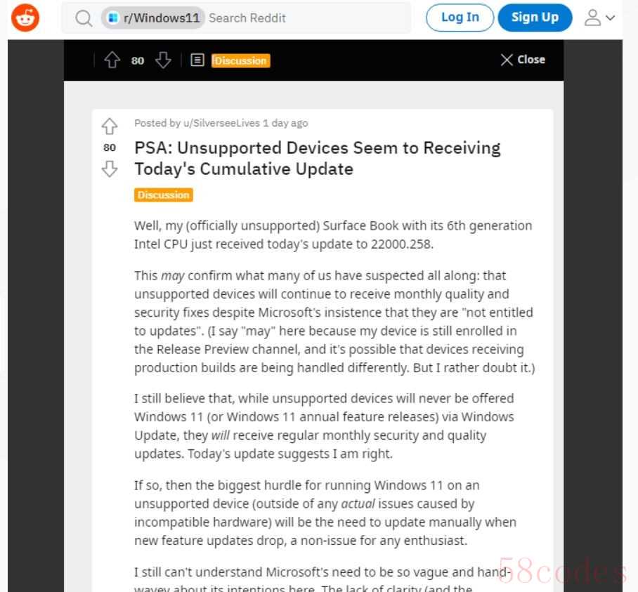 好消息是目前已有不少 Reddit 网友宣称可在不受支持的设备上接收 Windows 11 更新。此外 Windows Central 证实,至少 2021 年 10 月的累积更新是没有限制的。