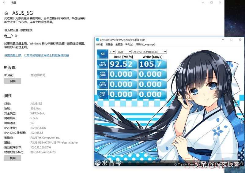 ▲首先采用USB-AC68 连入 RT-AC86U的5G WiFi,然后把我的NAS(有线千兆网线连接)虚拟成本地电脑的Z盘映射盘,实测网络连接速度。这个速度基本上是顶格了,因为无线网络与有线网络的转换,以及信号传输需要封包都会挤占传输带宽。