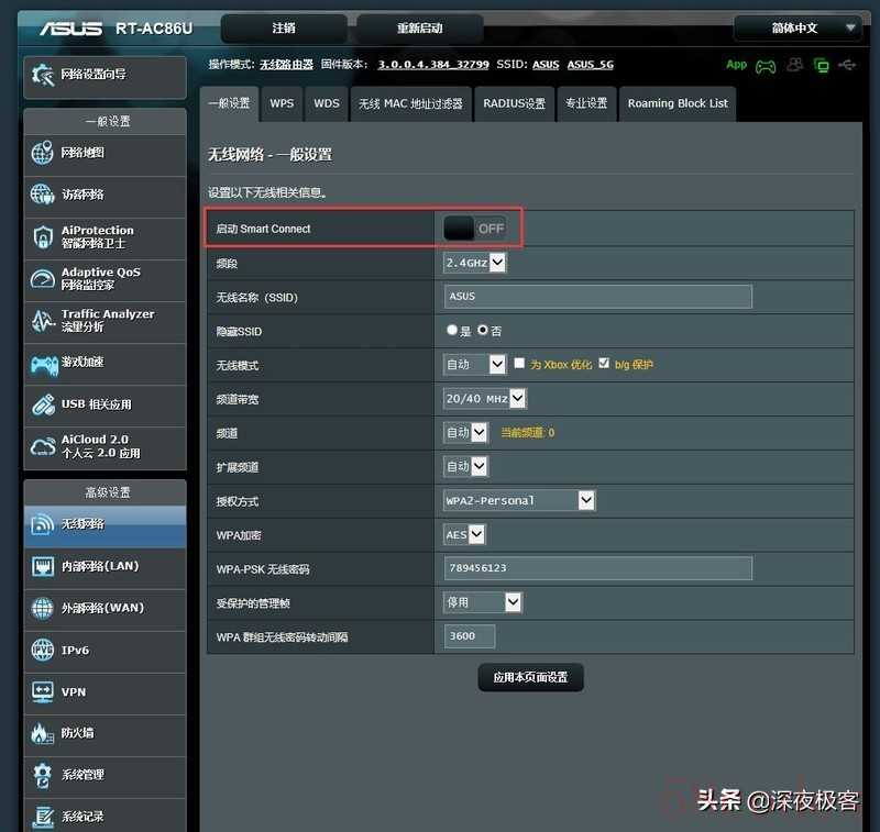 ▲如果想要关闭2.4G 与 5G智能选网,可以在无线网络界面,把Smart Connect这个功能关闭即可,而且华硕的路由器还有为Xbox的用户进行联网优化。