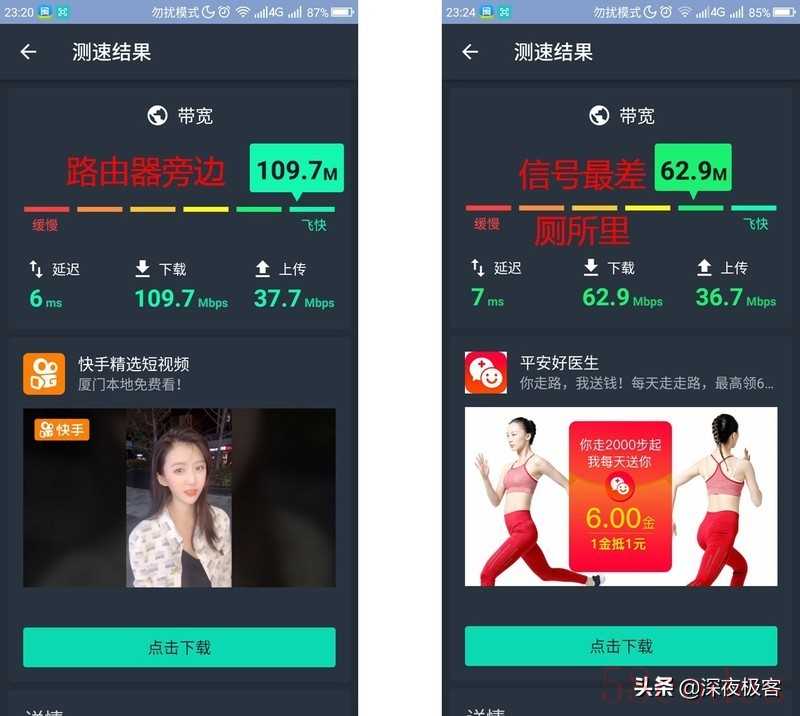 ▲我们来实测下,在路由器旁边的100M宽带实测,与在信号最差的厕所里的信号实测对比,你会发现,就算在信号最差的厕所里,刷微博、看视频、看电视剧、玩游戏(延迟并没有神马提高)都还无问题的。实测是不要迷信信号强度,够用就够了。毕竟SRRC标准会比较严格。