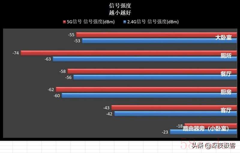 ▲一张图汇总,2.4G信号衰减较少,但是5G信号传输速度快,而且靠近路由器的话,信号强度还非常不错。神马?你说5G信号厕所使用起来好弱??????