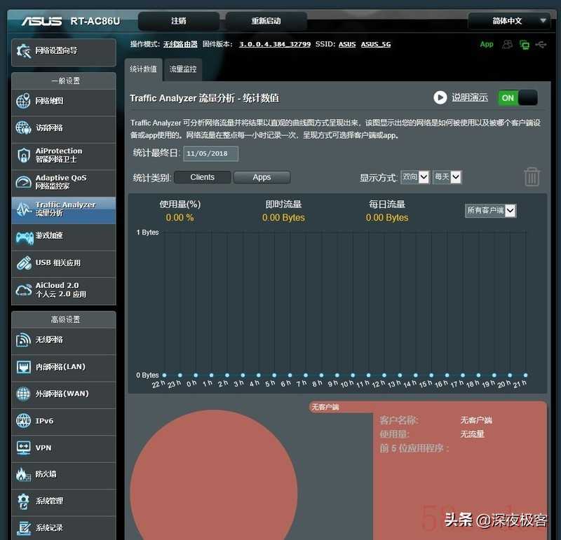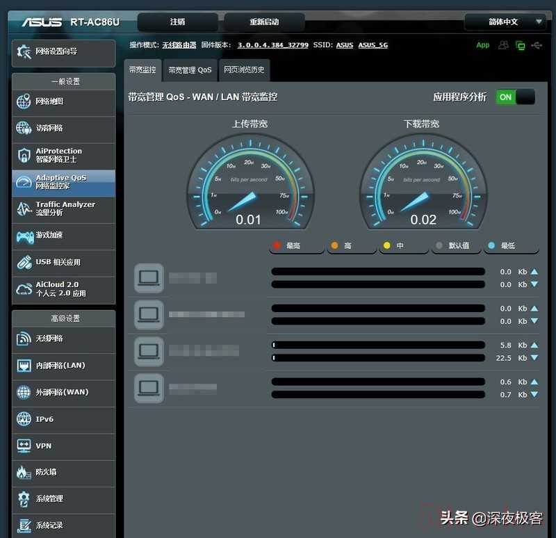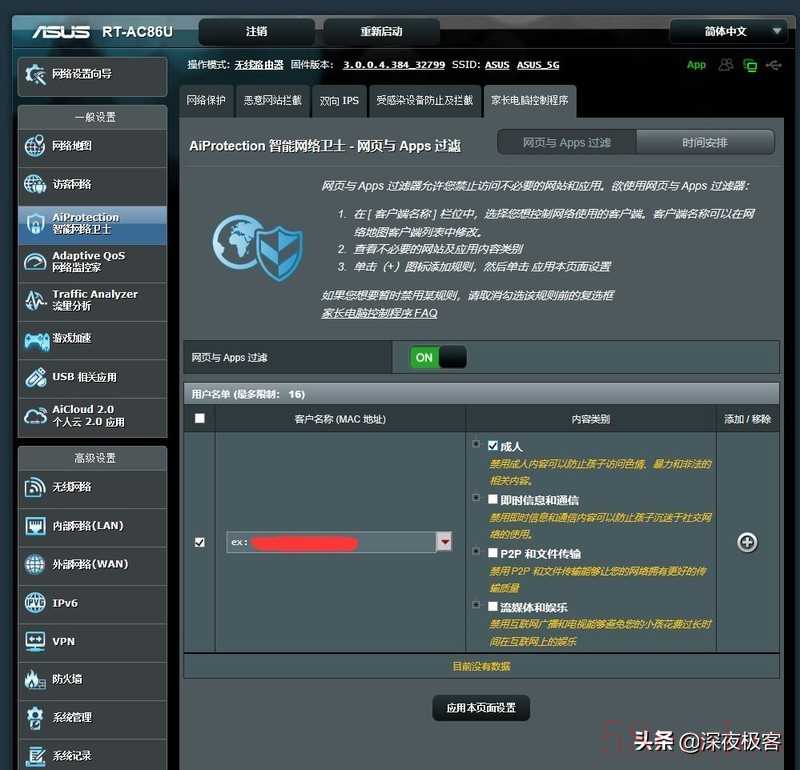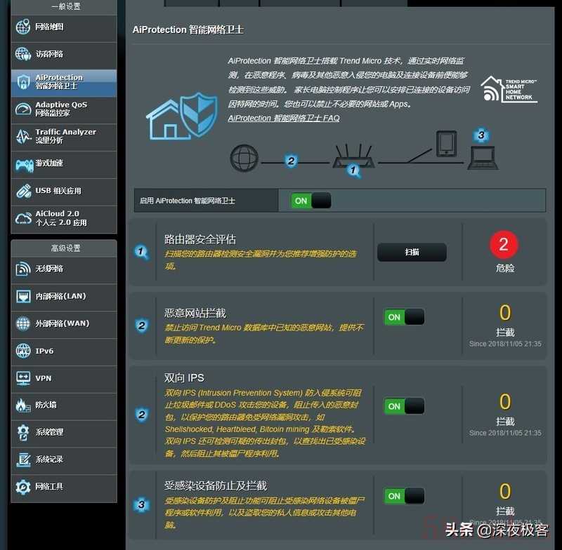 ▲66ub1以上型号的华硕RT路由器都自带智能网络卫士,为家庭网络提供路由器级别的安全防护,我在86U上把这些安全防护措施都开起来。