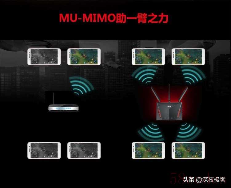 ▲AC86U还支持博通方案的MU-MIMO,当多台博通mu-mimo设备同时接入86U中,会并行吞吐,降低各设备的延迟,提升WiFi接入效果与速度。