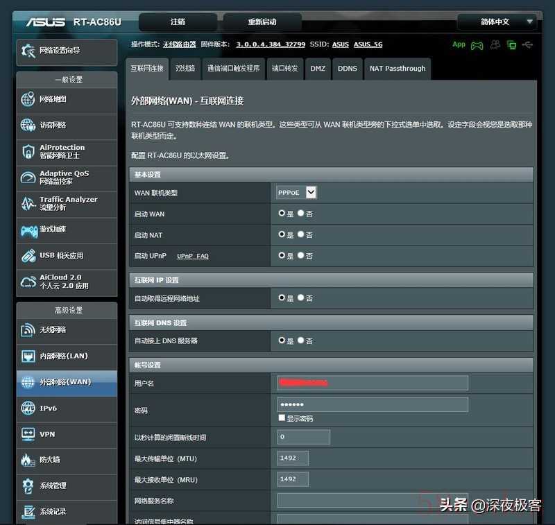 ▲一般来说,新路由器到手,就要进行初始化设定,我是采用光猫桥接拨号,在AC86U处进行拨号,光猫的WiFi关闭,光猫仅用来光电转换+桥接,最大可能解放光猫,延长光猫寿命。然后把2.4G跟5G分开设置,形成两个独立的信号。当然不分开也是可以的,AC86U支持自动切换信号技术,可以自行自动分配。