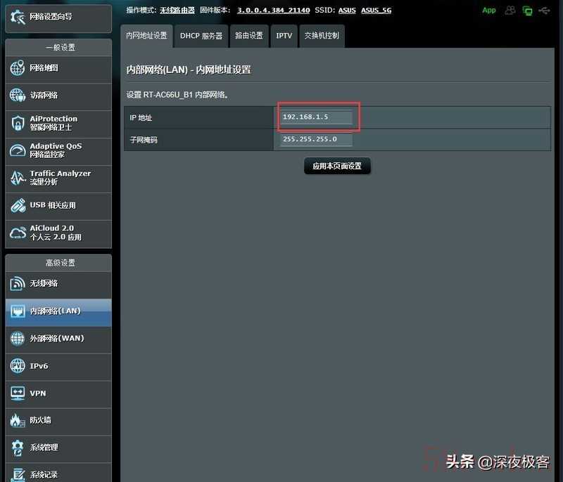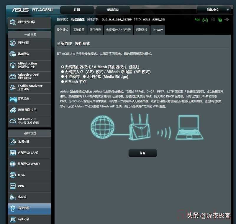 ▲在系统管理界面可以选择路由器的工作模式,一般来说,默认即可,如果有更新迭代淘汰下来的华硕RT路由器,可以开启AiMesh,让你的RT路由器简单的当做AiMesh设备。