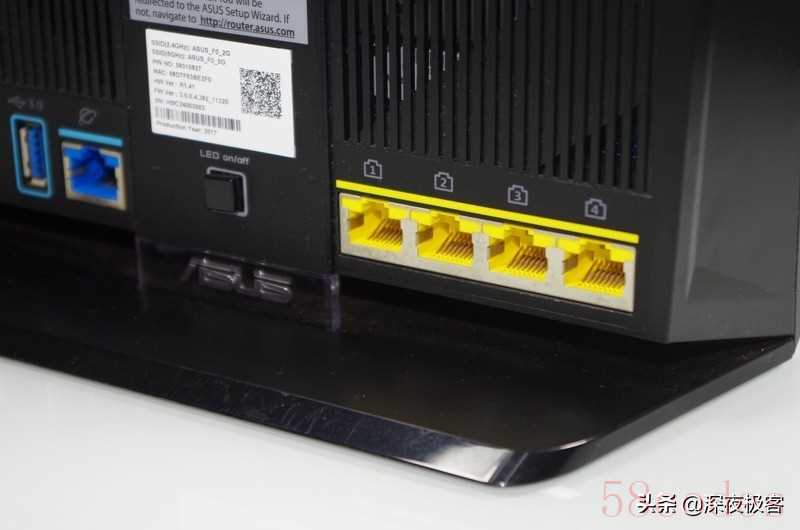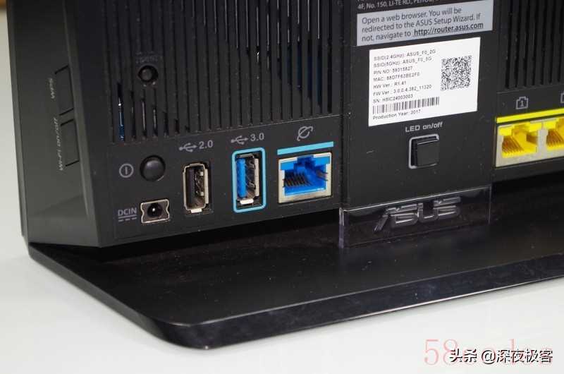 ▲左侧的上方有个复位/重启按钮,下方有电源键、电源插口,有USB 2.0 USB 3.0接口,以及一个蓝色的WAN口,中间有个LED灯控制按钮,底部还有个亚克力的华硕LOGO。