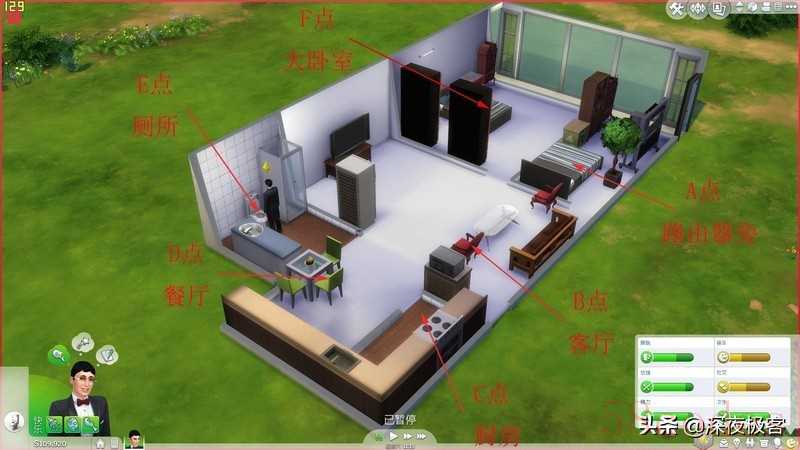 ▲大家在意的信号强度测试,我家的布局图,emmmmmmm 画图软件叫 模拟人生4,对就是那个卖DLC的EA做的。上图中标注出常用地点,下图是含墙视角,可以看出信号穿越了几堵墙。路由器就放在小卧室,我的房间,距离床仅有1米的距离。