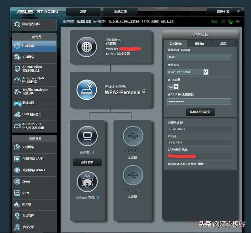 ▲设置完后进入主界面,整个路由器状况一览无余。......等等我好像没把NAS接入进来,我去接NAS。