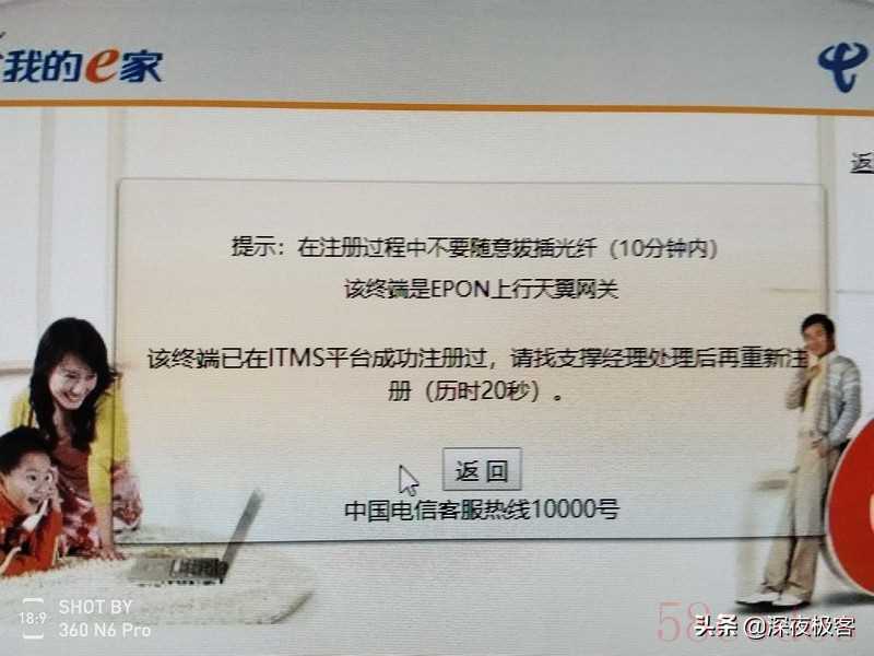 ▲情况3 在注册过程中出现“该终端已在ITMS平台注册过,请找支撑经理处理后重新注册。”此时你要做的是,拨打通讯运营商客服电话,或者本小区的技术员/客户经理。跟客服/技术人员/客户经理说,自己自购了自家这个区域的定制版光猫,正在更换,请求技术支持。如果是客服,会帮你登记电话,并且帮你下单给技术人员,在得到的答复后,一般此时要提供自己的LOID或者宽带账号,并且提供光猫的后6位机器码。当然,技术人员会加你的微信,请你提供光猫LOID的一些情况,并把自己掌握的一些情况跟你通报。
