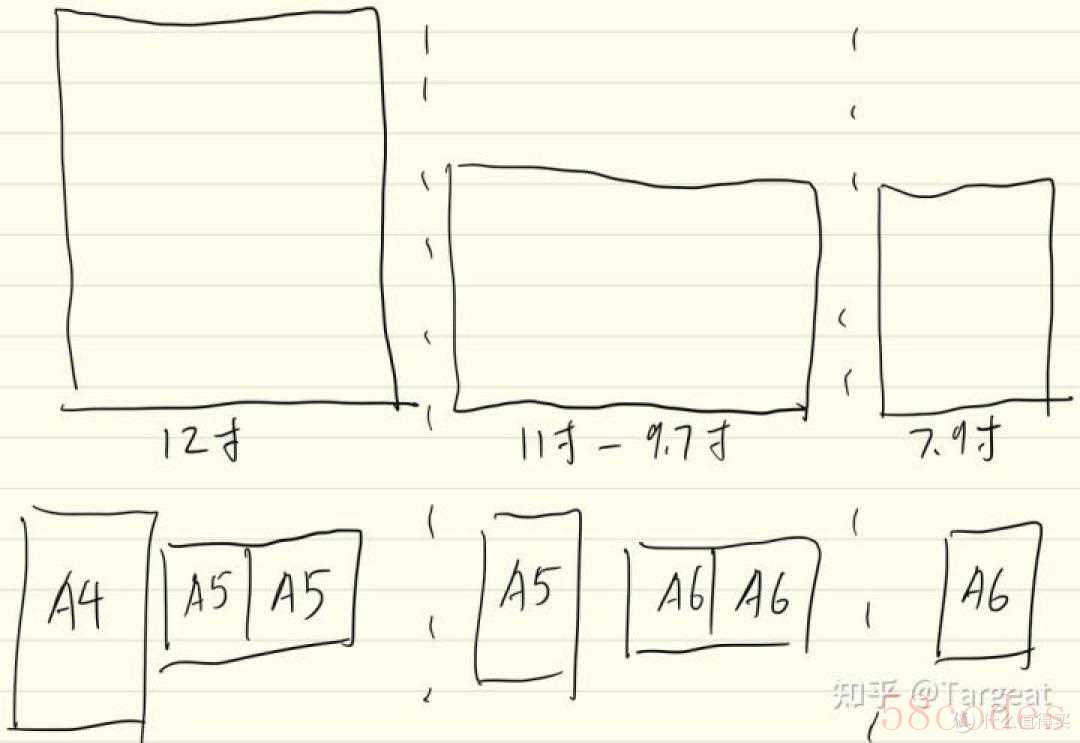 iPad尺寸繁多但仍然符合纸张的规律,你只需要拿出一张A4纸就能参考。12寸适合完整a4纸的竖屏观看,分屏时,显示尺寸约等于两个a5笔记本,这是我认为最适合分屏一边看文档一边记点什么的尺寸。而11-9.7竖屏显示就类似于书店买的a5笔记本,分屏时体验就不怎么好了,看pdf可能需要不停地缩放。而7.9寸的mini,额....能忍的话也行吧,至于分屏....。