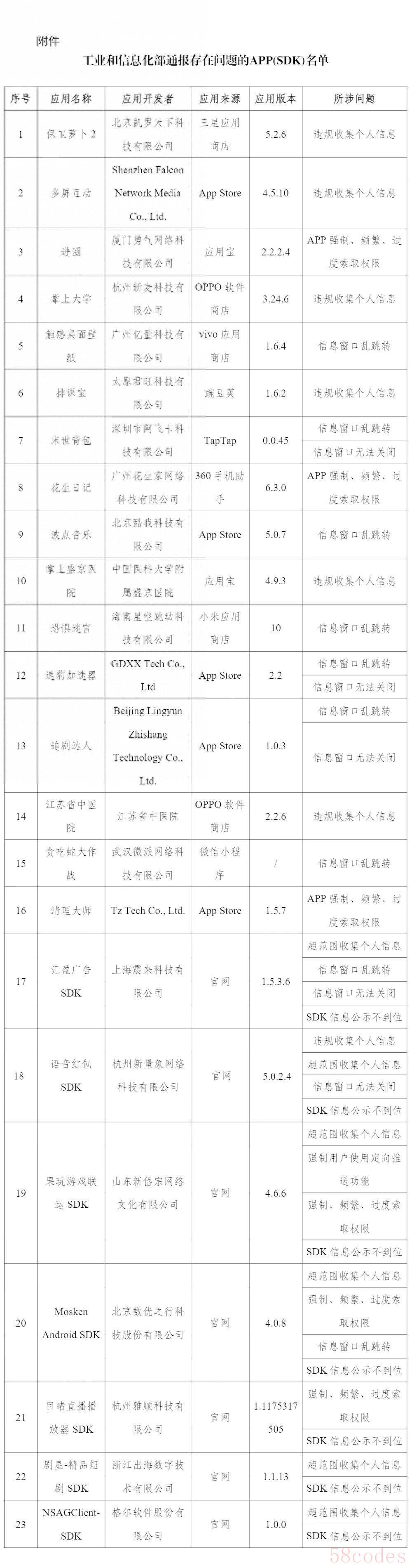 附件:工业和信息化部通报存在问题的APP(SDK)名单