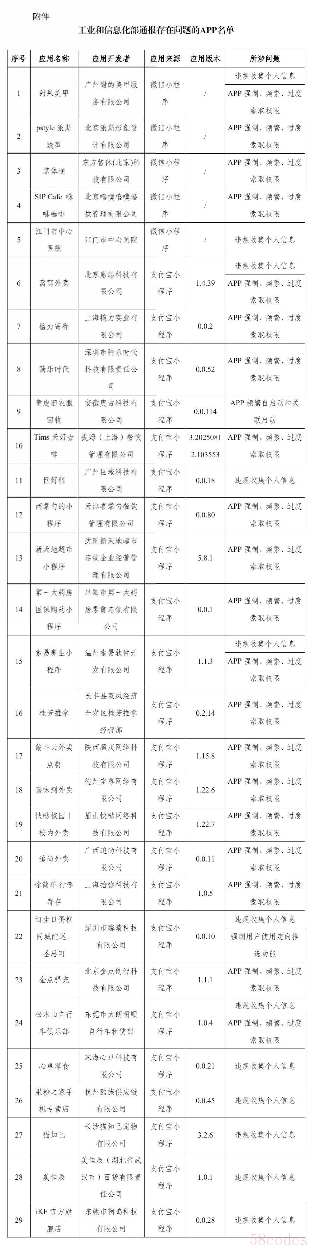 人民网北京9月18日电 (记者申佳平)据“工信微报”消息,根据中央网信办、工业和信息化部、公安部、市场监管总局等四部门联合发布的《关于开展2025年个人信息保护系列专项行动的公告》,依据《个人信息保护法》《网络安全法》《电信条例》《电信和互联网用户个人信息保护规定》等法律法规,工业和信息化部对APP违法违规收集使用个人信息等问题开展治理。近期,经组织第三方检测机构进行抽查,共发现29款APP存在侵害用户权益行为。