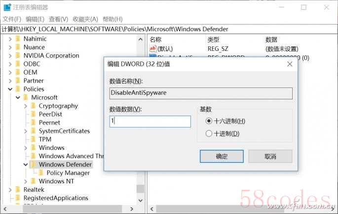 在右侧新建名为“DisableAntiSpyware”的DWORD(32位)值,并将其数值数据修改成1。