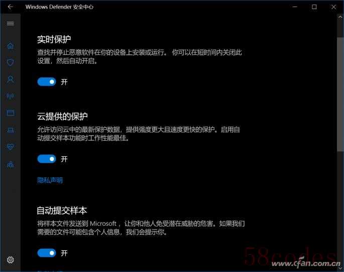 其实,一般情况下,只要Windows Defender不在后台运行病毒查杀,它对系统资源相对是比较友好的,而且只要在安全中心中,把“实时保护”、“云提供的保护”和“自动提供样本”这三个选项关闭掉,基本上就不会影响第三方防病毒软件和系统的正常运作。