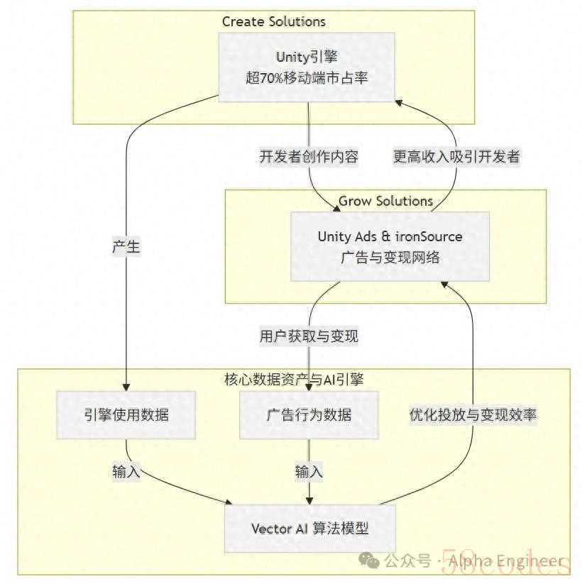 Unity通过Create(创作)和Grow(增长)两大业务构建了独特的“创作-运营”协同飞轮,形成了强大的数据壁垒和网络效应。