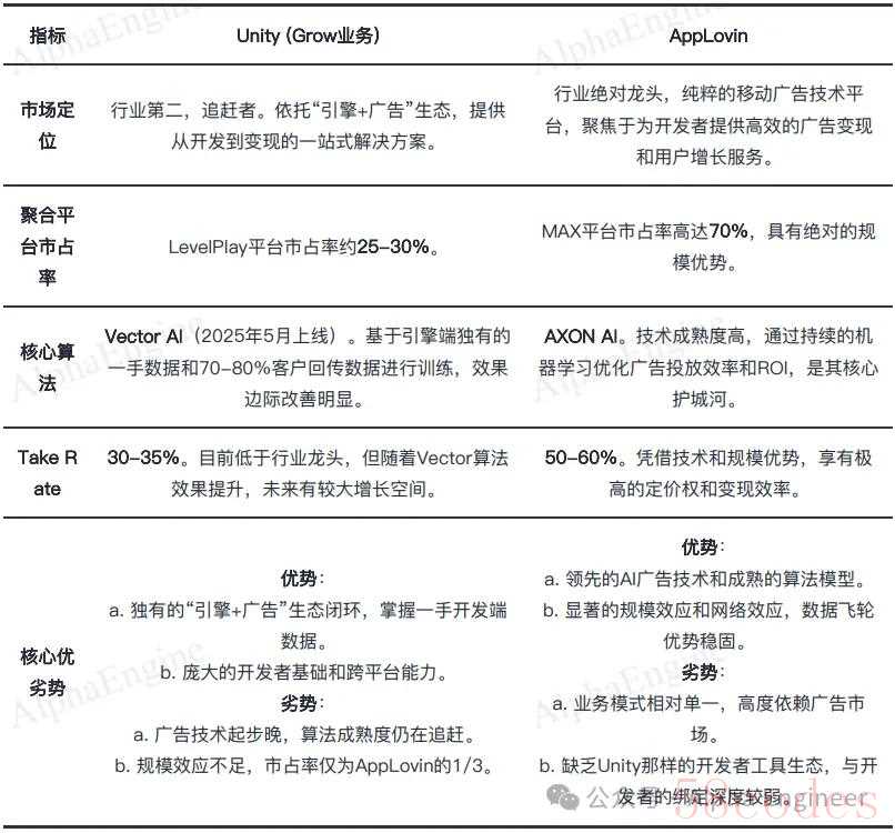 在移动游戏广告技术领域,Unity(Grow业务)与行业龙头AppLovin形成“双雄”格局。
