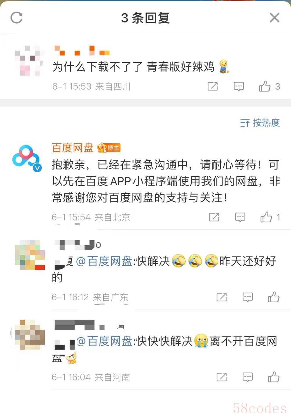 6月1日,有网友在百度网盘的官方微博下留言“为什么下载不了了”。