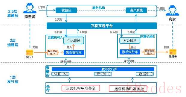数币采用了中心化管理、双层的运营模式,央行负责数币的发行,运营机构负责数币钱包的开通和兑换,服务机构负责推广和流通。