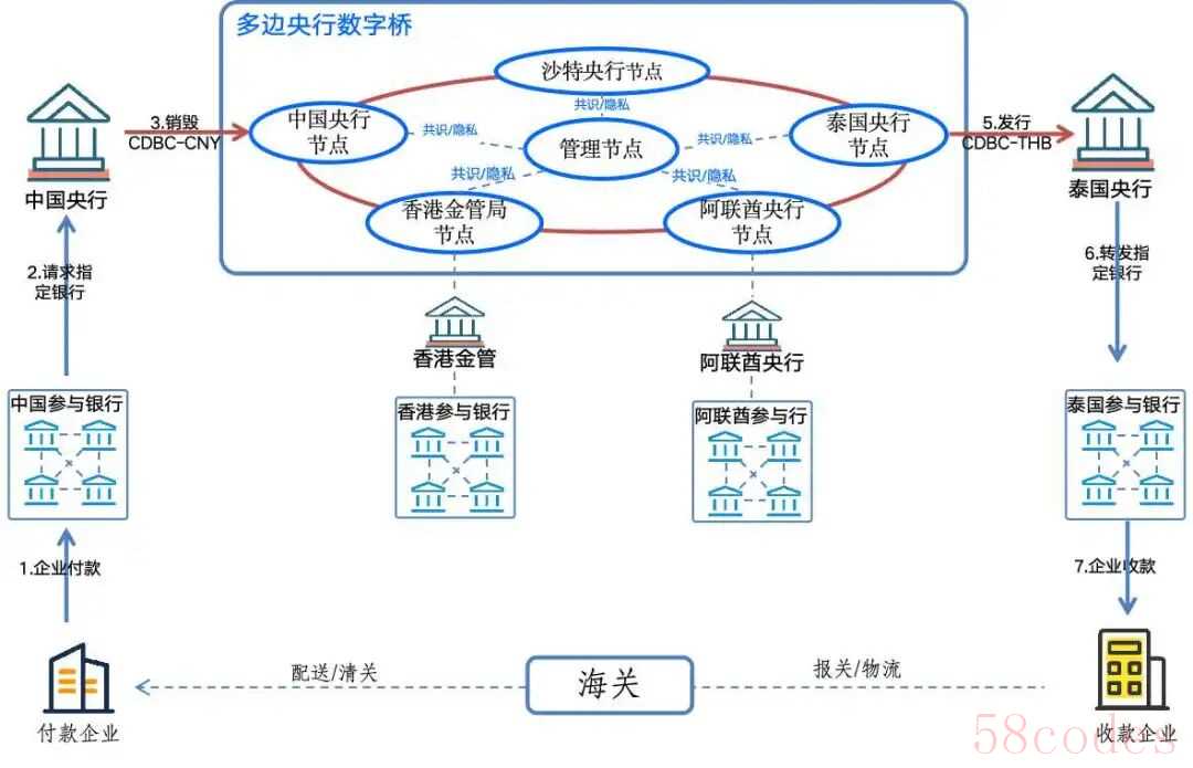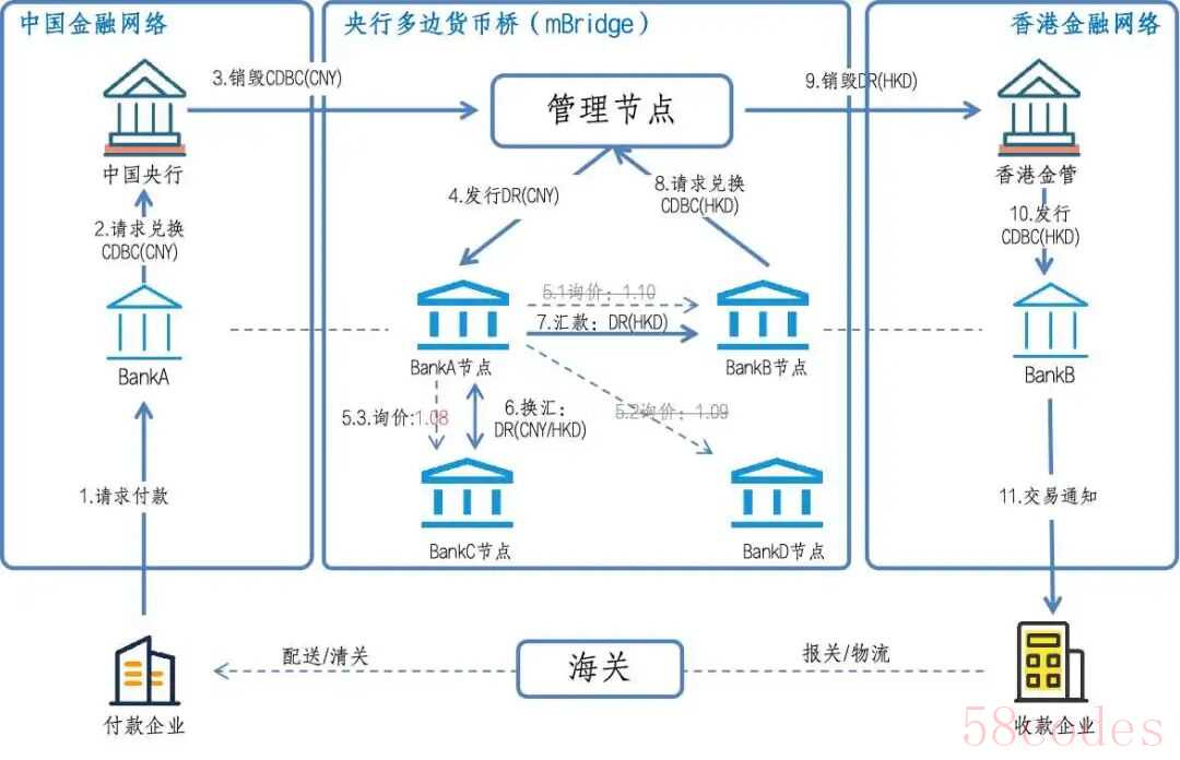 ①支付请求:中国企业在A银行,通过数字人民币(CDBC-CNY)向位于香港的B银行账户进行跨境汇款。