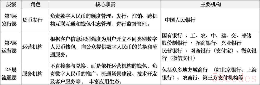 "第一层:中央银行 (PBOC) 与指定运营机构 (指定运营机构)":PBOC向指定的商业银行(如工、农、中、建、交、邮储等大型银行,以及部分中小银行和支付机构)发行数字人民币,并管理发行和流通。