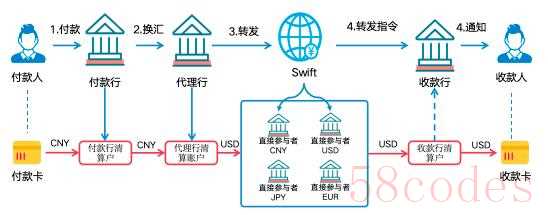 传统跨境支付就是银行之间相互开对方国家货币的账户,然后清算网络传输报文让银行之间的资金进行接力传送,最终转到指定用户的账户上。这套模式在全球顺利运转了50多年,形成了清算银行+代理行的模式,并且全球主要银行普遍使用SWIFT作为报文传输标准。