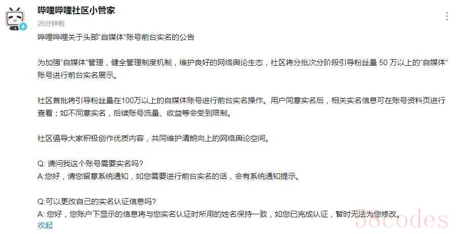 哔哩哔哩关于头部“自媒体”账号前台实名的公告
