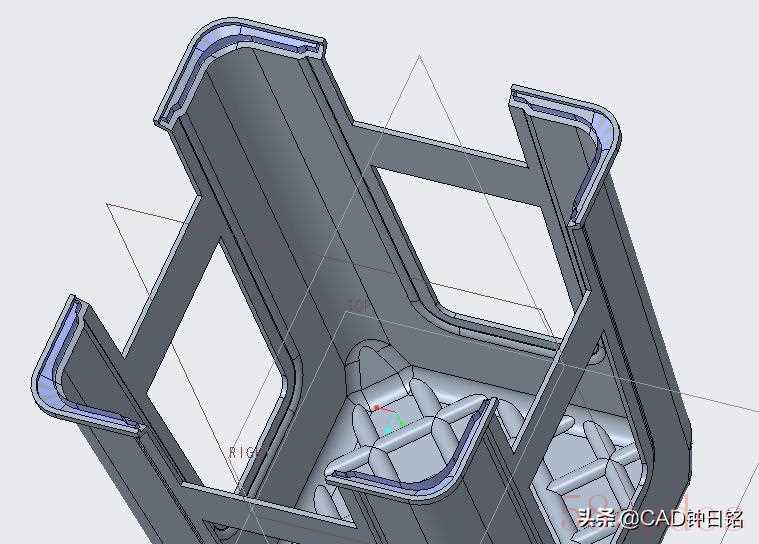 (36)使用拉伸和阵列工具,获得凳脚底部如图40所示的相关结构,这是考虑到塑料特点,塑料需要保证壁厚要求,不至于缩水,厚的地方需要掏掉些材料。