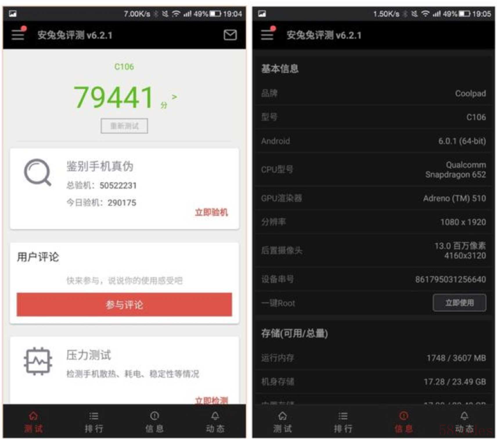 高通骁龙652为cool1 dual带来不俗的性能,安兔兔测试分数是79441分,分数属于中上游水平,当然了,与一些例如联发科的helio X20这类专为跑分而生的处理器来说,分数可能会显得稍微落后,但从整体上的性能已经能应付不少高要求的操作。