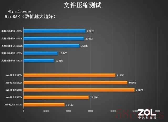 文件压缩能力总结:文件压缩一方面会考验处理器的多线程能力,另一方面也会考验处理器的兼容性,在这项测试中一般核心过多的处理器很难将所有核心全部调用起来,分数其实很不稳定,不过在文件压缩测试中锐龙5000系列处理器还是依靠强大的多核心性能胜出,现在锐龙处理器兼容也越来越好,使用很少出问题。至于十代酷睿则更不容担心兼容问题,英特尔的生态庞大,十代酷睿不用针对性优化也能获得很好的性能,在兼容方面更是不会遇到问题。