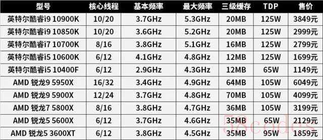 英特尔酷睿i9 10850K:10850K是英特尔8月份推出的性价比i9型号,它的频率更低,在测试中我们也能看到这款处理器跟酷睿i9 10900K差距不大,在价格上这款处理器比 i9 10900K便宜了快1千元,如果不是特别追去频率,又需要10核心20线程的用户,建议考虑酷睿i9 10850K,不过这款处理器超频性能一般,看中超频的玩家慎重考虑。