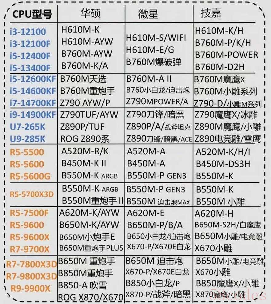 然后给大家分享一下选好CPU后适配的主板品牌和型号,大家可以收藏起来