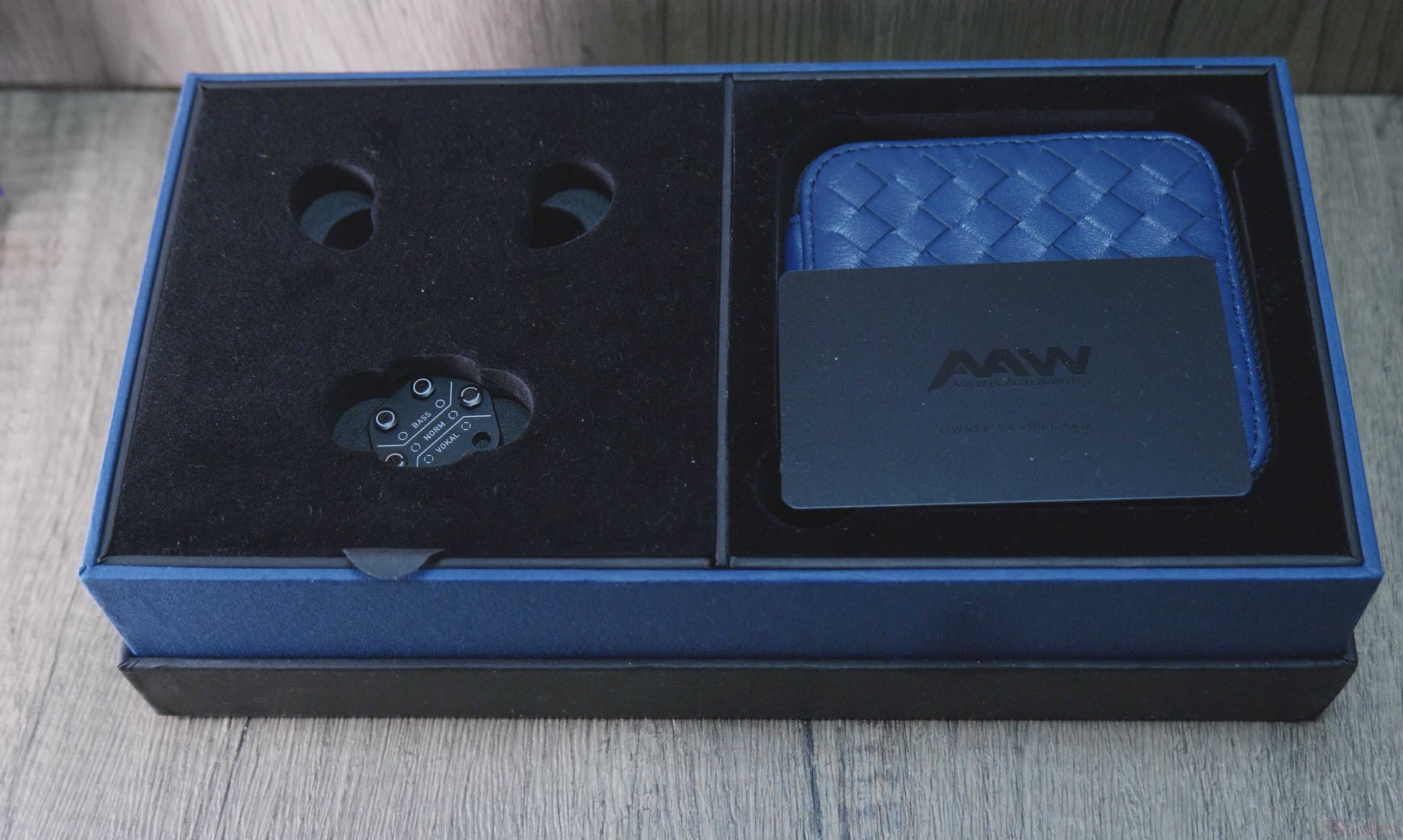 AAW翡翠鸟的包装盒内就是普通的耳机包装盒佩戴的附件,一个精致的皮质耳机包,调音的配件,和AAW的序列卡。