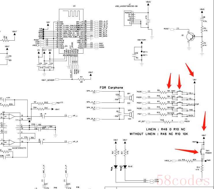 开机后(主板上的灯会闪),先用蓝牙连接手机,用同样的方法测出其它功能键后,串的电阻就可以取下,直接接,一般都不用另外接电阻,主板上有,有些是1点几的高电平(如下电路图就是1.8V),可以在电路板上测,一般有有测试点或接口,或直接接电池正极。