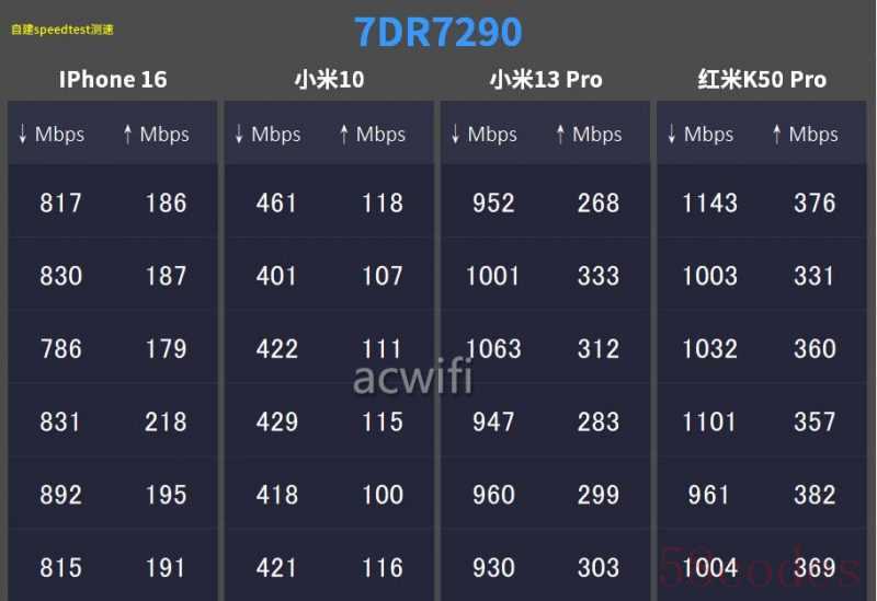 以后换个方式测K点:用自建speedtest测速了, 这样还能看见无线上行速度的上限,而且不受测速节点不稳定的因素影响,之前speedtest测速APP也不能用了一段时间 。我会把同一个品牌下,我的手里有的机器,都重测一篇,以每个品牌为一篇汇总,以后都加到里面去,方便大家挑。7DR7290的K点测速结果如下图:(用四台不同的手机放在K点位置测速,只测5G,信道44,频宽160MHz )