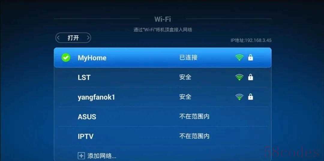 找到盒子的设置,用无线wifi连接家里的无线路由器。如果无法连接,就拔掉网线再试试。无线连接成功后,记住右上角的IP地址,咱们后面要用。