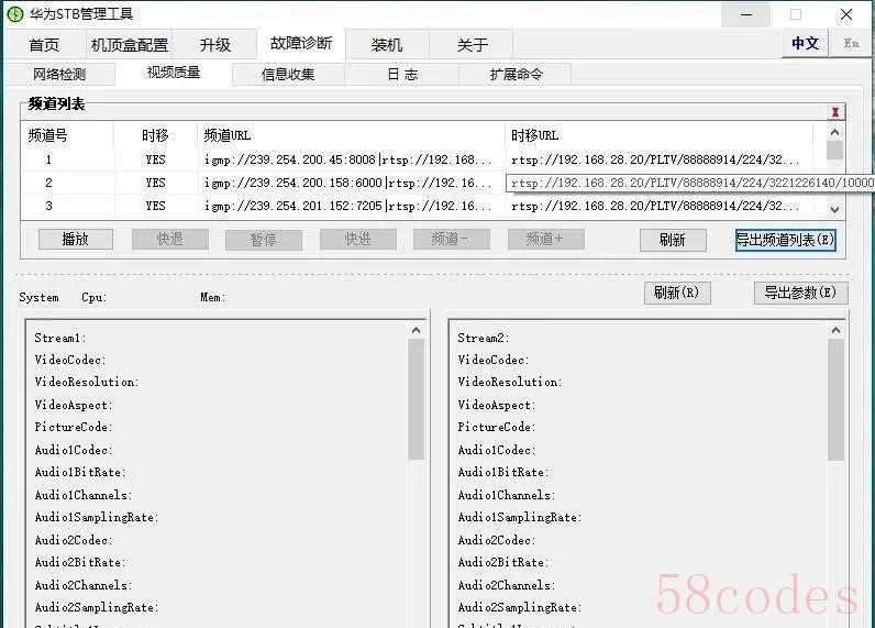 连接成功后,找到故障诊断选项,然后点击一下刷新按钮,这时候就能看到频道列表里已经有信息了,这些就是视频源。我们点击导出频道列表按钮,将信息保存到TXT文件中。