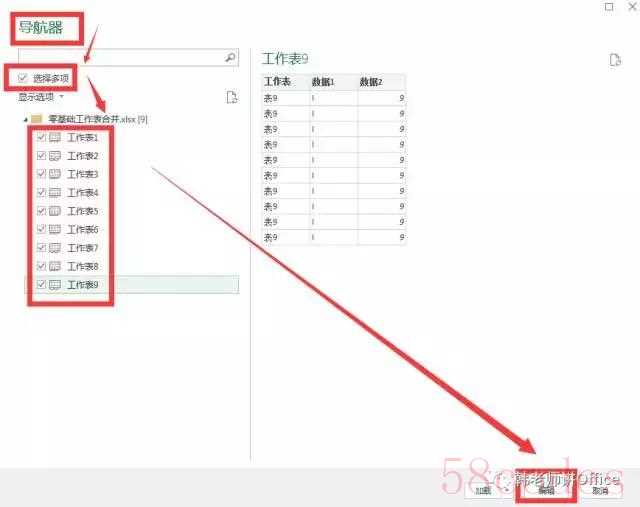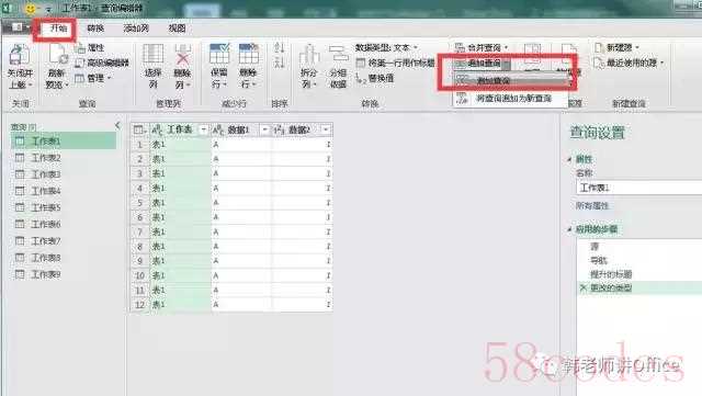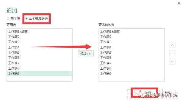 将需要合并的9个工作表添加到右侧“要追加的表”,确定: