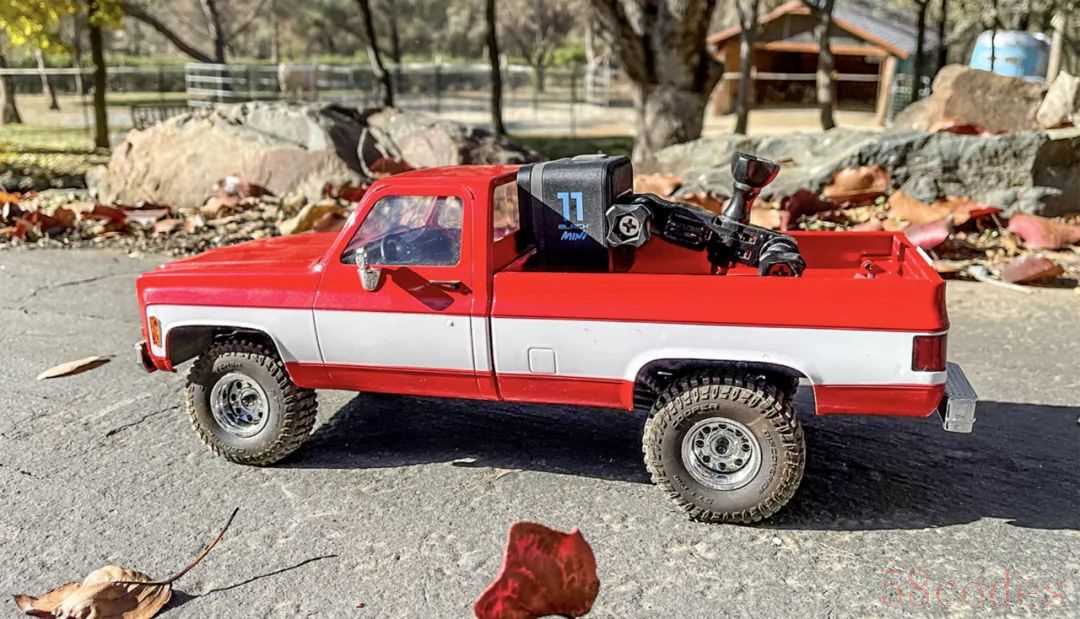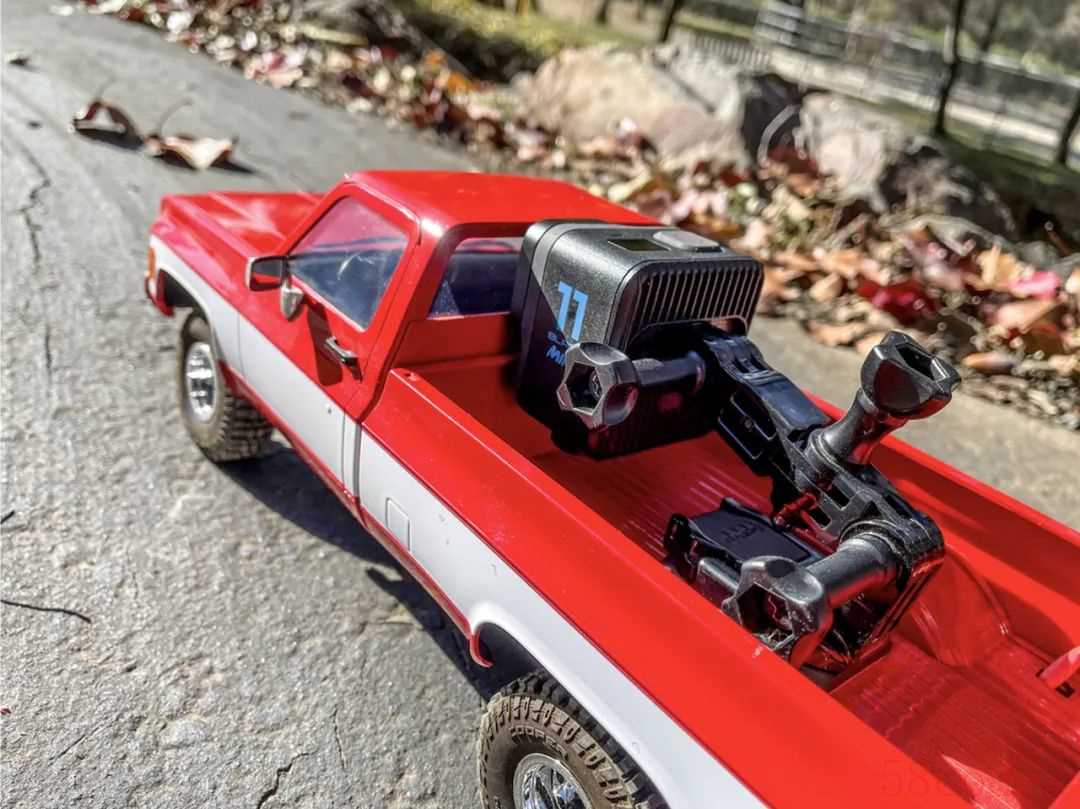 从这个1:24比例的遥控卡车的尺寸可以看出,HERO11 Black Mini和支架占据了车斗的大部分,增加的重量确实有点头重脚轻。