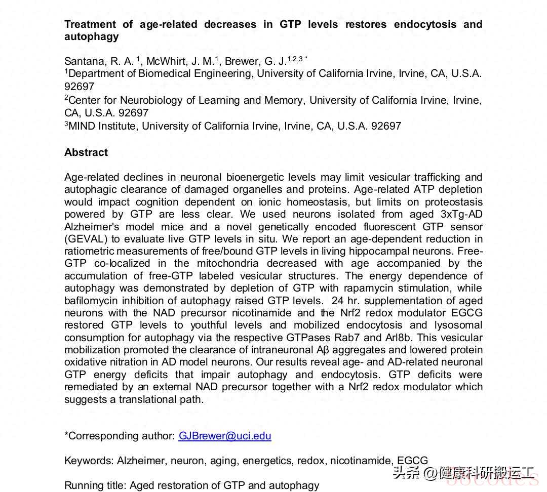 DOI:10.1101/2025.06.09.658689)发表了一项突破性研究,首次揭开了“年龄相关GTP deficit(GTP能量缺口)”是导致大脑“垃圾堆积”、诱发AD的关键元凶,并找到一种简单可行的干预方案:用大家熟悉的绿茶提取物EGCG,搭配维生素B3家族的“ nicotinamide(烟酰胺)”,仅需16小时就能让老化神经元“返老还童”,清除脑内毒性蛋白!