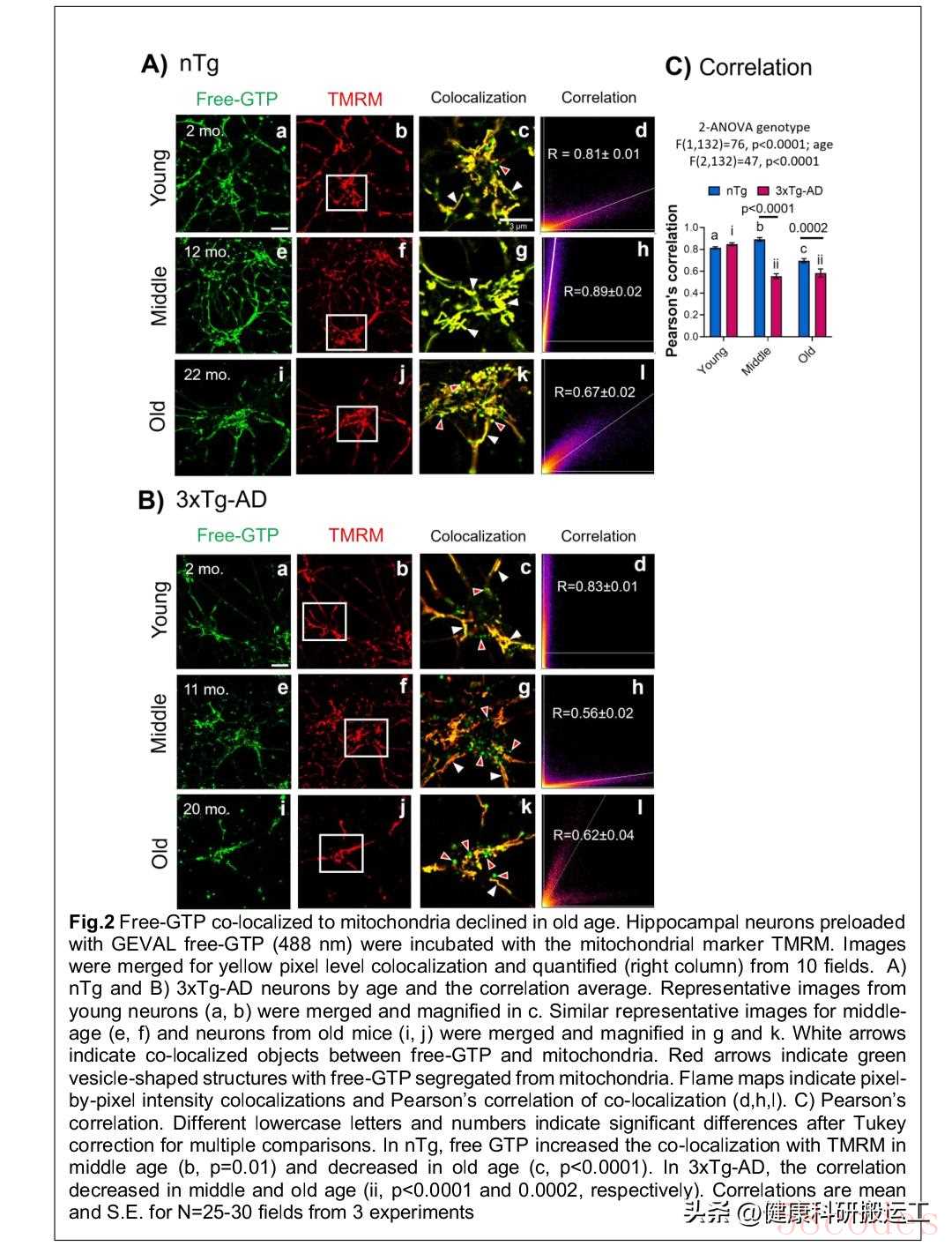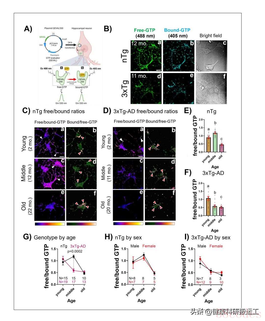 - 普通小鼠(nTg)到老年(17-28个月)才出现GTP显著下降,而AD模型小鼠在中年(8-11个月) 就出现GTP暴跌,降幅远超同龄普通小鼠(p=0.0002);