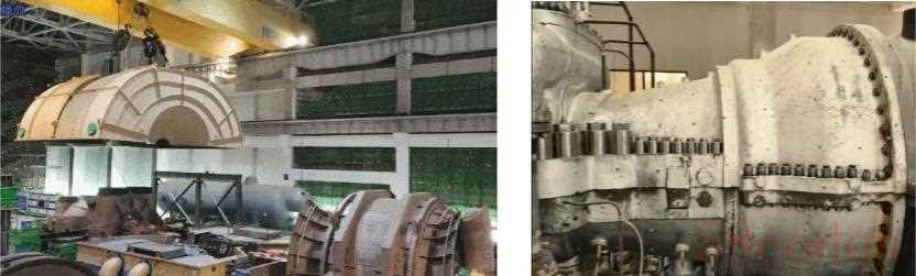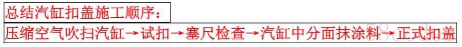 ① 连续进行,不得中断:上、下汽缸闭合也称汽轮机扣大盖。汽轮机扣大盖时扣 盖区域应封闭管理,扣盖工作从向下汽缸吊入第一个部件开始至上汽缸就位且紧固连接 螺栓为止,全程工作应连续进行,不得中断。